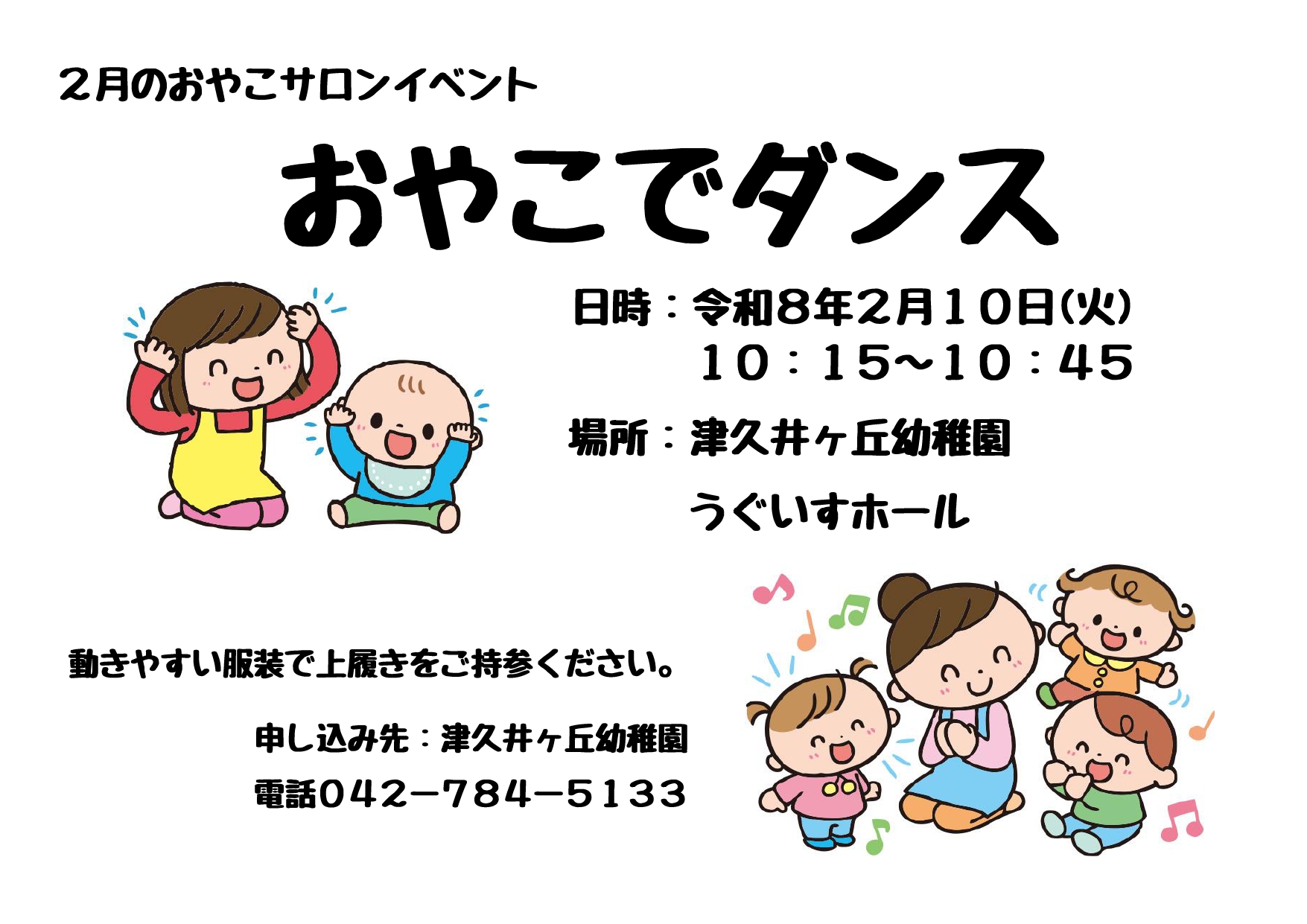 お知らせ カテゴリー別 在園児向け 未就園児向け イベント その他 2月のサロンイベント 2026.01.28 イベント 未就園児向け 2月のサロンイベントは、毎年恒例の親子ダンスです。 講師の先生と一緒に、体をいっぱい動かしましょう! 前へ 一覧へ戻る