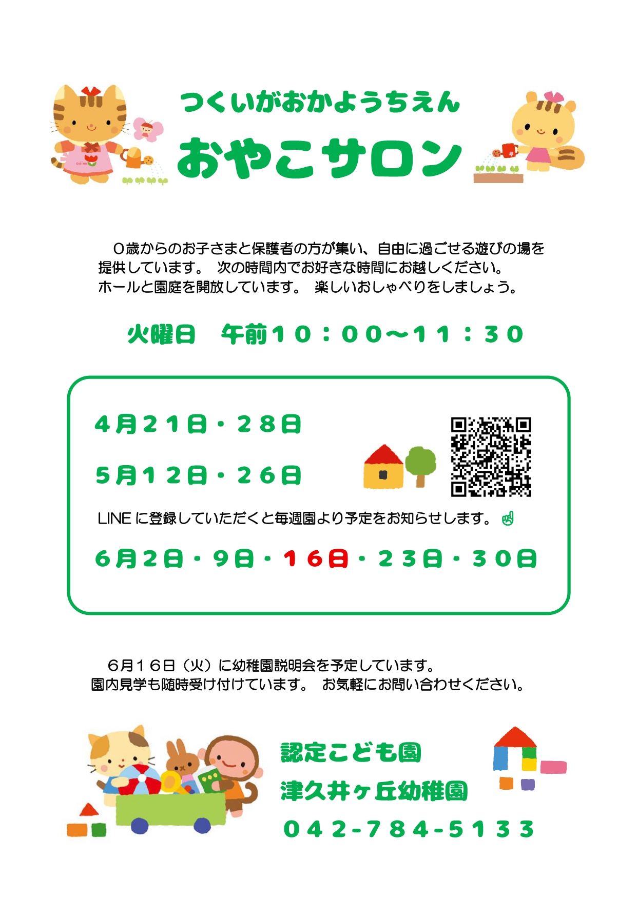 お知らせ カテゴリー別 在園児向け 未就園児向け イベント その他 4・5・6月のサロンのお知らせ 2026.03.02 未就園児向け 春の風とともに、新しい一年がスタートします。 新しいお友達と園庭やホールで思いっきり遊んでください。 前へ 一覧へ戻る